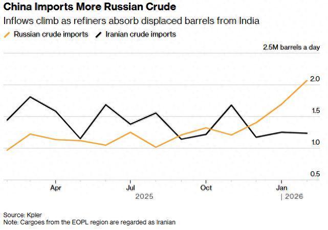 目下来看,跟着俄罗斯强行拥入市集,伊朗似乎正碰到打击。船舶跟踪数据骄气,在2月的前18天,运抵中国口岸的俄罗斯石油增至逐日209万桶。这比1月份增长了约20%,比12月增长了约一半。